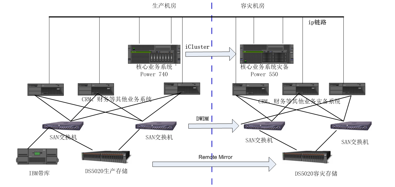 替换下来的原i550服务器将作为容灾机房的核心生产备份服务器,通过iCluster软件同步复制生产端的生产数据,保证数据一致性,从而达到容灾的目的。