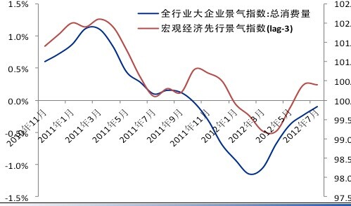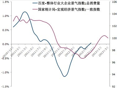 上图中,蓝线是百度大企业指数,红线是中国经济景气监测中心发布的经济先行指数,二者的相关系数为90.5%,并且,百度大企业指数领先于经济先行指数3个月。如果和中国经济景气监测中心发布的经济一致指数相比较,发现百度大企业指数领先5-6个月。如下图