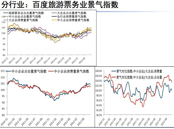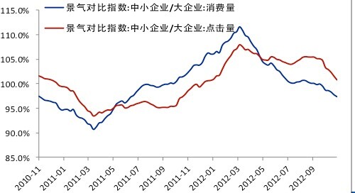 如 果说百度大企业指数能够一定程度上代表了中国经济景气监测中心的经济景气,那么,百度中小企业指数是否也可以代表统计局没有调查到的中小企业运行状况 呢?这是我们的一个推断,当然还需要进一步的验证。我们还构建了景气对比指数:景气对比指数=中小企业景气度/大企业景气度,景气对比指数小于100%, 说明中小企业景气扩张程度低于大企业景气度,景气对比指数值越低,说明中小企业相对于大企业的运营状况越差。