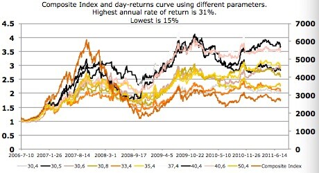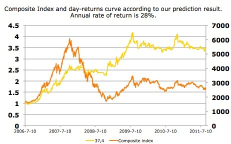 这种分析股票市场的方法靠不靠谱呢?下面列举下2011年的测试数据,当时作为指导教师,带领中科院的几个学生拿这项研究成果参加了“2011花旗杯金融信息技术应用大赛”,还拿到了全国第七名的成绩。记得当时白硕老师还是大赛评委,再次向白硕老师表示感谢。