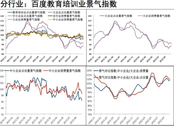 每个行业形态各部相同。一个有意思的现象是:发现教育培训业的指数具有反经济周期规律。我们结合中科院管院MBA招生情况,还真是经济比较差得时候,我们 MBA招生比较火爆。说明大家可能在经济萧条时更喜欢充电学习。这项研究,百度大数据部正在进行产品上线,如果顺利的话,下半年大家就会看到有相关数据的 定期发布。