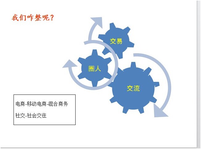 王甲佳:我们正在筹备一个项目,另外有机会再具体分享。O2O中,线上为线下导客、成单,或者相反方向的,可以理解为是特例,或者是第一阶段的情况。线上和线下的 融合其关键在于在交易的链条上,以及从这个链条发散开去,我们发现许多业务动作(商家对消费者的动作)和可以被分解并用更恰当的线上或者线下动作来表达 的。比如可能有一个社区,为消费者提供分享消费体验的便利。触发更多的消费者了解产品。所以传统企业如何将既有的客户存量通过移动互联网沉淀到自己的“数 字地盘”--自己的系统,是一件紧迫也不算复杂的事情。它需要将消费者置于一种氛围之中,那样交易就可能是水到渠成的事情,在前面的片子里面说到的“圈人 --交流--交易”如此也。