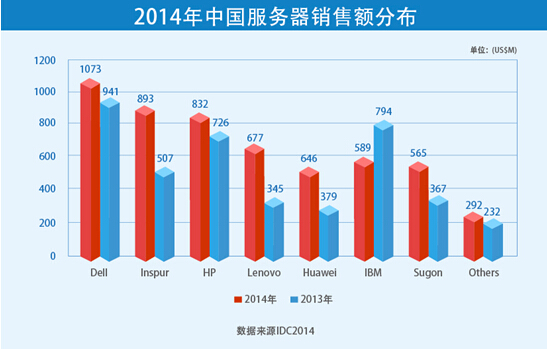 亮点三:2014中国服务器市场,本土厂商增速全球最快挤压国外厂商,也是全年最大亮点。其中,浪潮出货量增速全球第一,同比增长70.3%。销售额年比增长最大的厂商也是浪潮,其次是联想,第三是华为,第四曙光,第五戴尔,第六位惠普,IBM年比还下跌了很多。