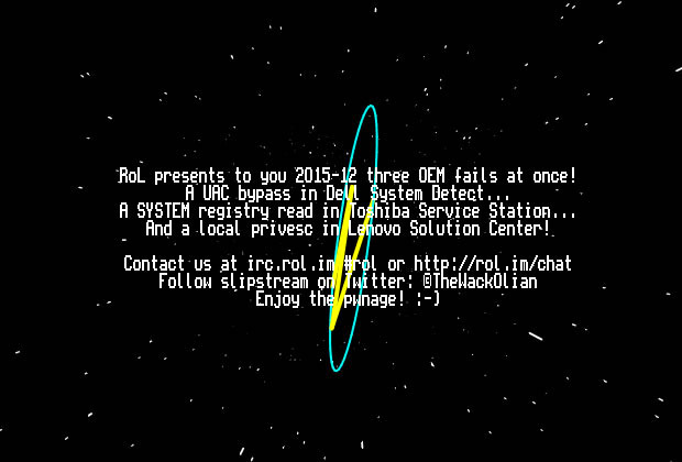 最近,PC厂商正在进行一场名为“PC Does What!?”的营销活 动,安全专家却指出三大PC厂商的电脑都不安全。一位化名为slipstream/ RoL的安全专家最近公布一段概念证明代码,它可以攻击戴尔、联想和东芝电脑的漏洞。专家没有先向厂商提交代码,而是直接向公众发布代码,这意味着数百万 用户的电脑面临潜在风险,不怀好意的人可能会利用代码从系统层面攻击电脑。