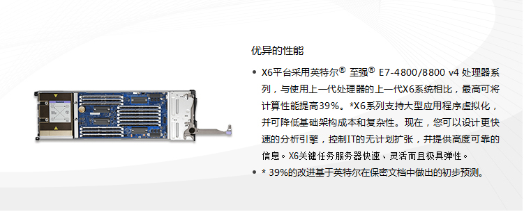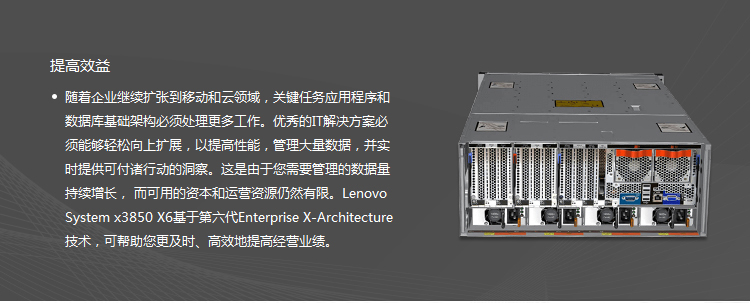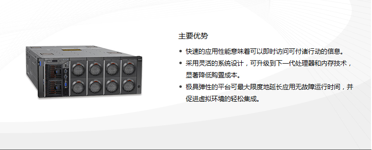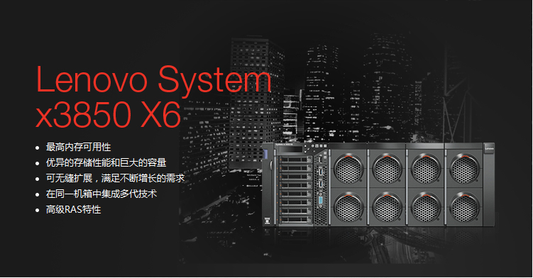System x3850 X6系列是一款大型4U机架式服务器,该机在整机性能空间、扩展能力、运行可靠性方面都具备较大优势,是大型业务的最佳承载平台之一。