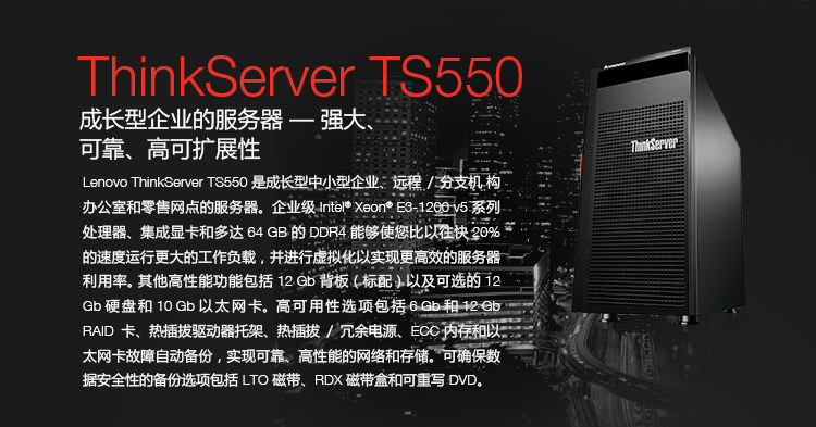 联想ThinkServer TS550是一款定位入门级的塔式服务器,该机在散热和噪音控制方面表现优异,基础配置扎实,是中小型企业专用服务器的优秀选择。TS550较强的扩展能力和对于磁盘阵列的支持进一步增强了整机的专业性和功能性,全面丰富的外部I/O接口也让该机在外接设备能力上明显优于机架式设备。