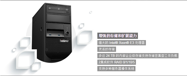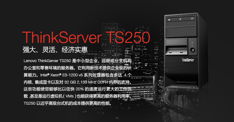 ThinkServer TS250服务器是一款4U塔式服务器,其能够方便用户集中部署和摆放。均衡的硬件配置也可满足企业日常服务平台的搭建和运行。TS250定位于中小型企业、远程或分支机构办公室和零售环境的服务器,拥有企业级的计算能力。