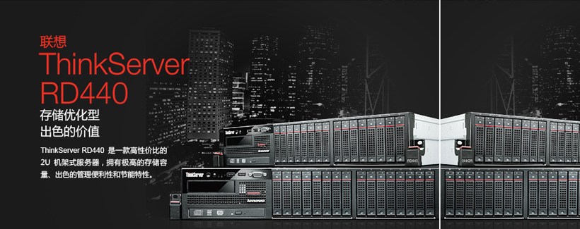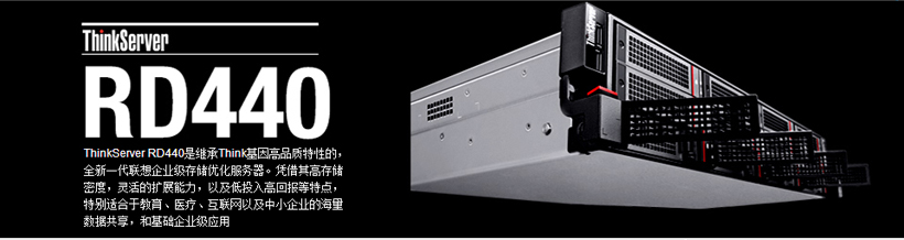 ThinkServer RD440是继承Think基因高品质特性的,全新一代联想企业级存储优化服务器。凭借其高存储密度,灵活的扩展能力,以及低投入高回报等特点,特别适合于教育、医疗、互联网以及中小企业的海量数据共享,和基础企业级应用。