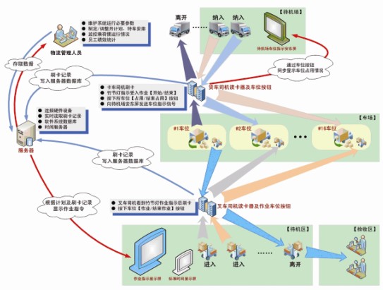 采用可编程控制器(PLC)技术、计算机软件编程、基于RFID身份确认技术和工业级器件构成企业物流调度指挥系统;系统分为物流管理上位机通讯与数据共享部分、物流调度管理部分、货运汽车部分、叉车司机部分;能够接收物流管理软件平台上位机系统指令,自动发布物流作业任务,货运汽车/作业员到位签到、作业结束签到,并将有关信息上传至上位机系统数据库。系统提供可视化的物流作业显示屏、使用颜色管理反应物流作业区状态等先进的、人性化、操作简便的物流调度指挥系统。