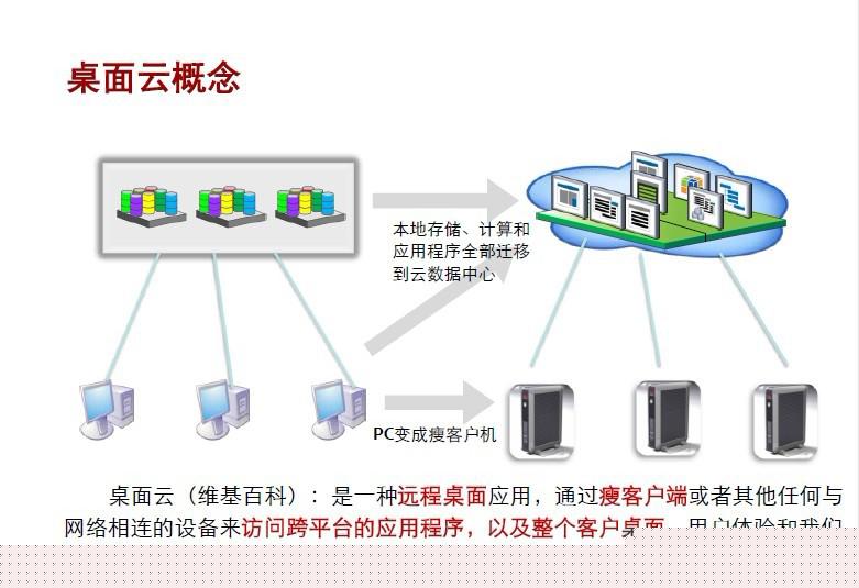 采用云桌面解决方案以后,每个瘦客户端的电量消耗在 16w 左右,只有原来传统个人桌面的 8%,所产生的热量也大大减少了成本减少IT 资产的成本包括很多方面,初期购买成本只是其中的一小部分,其它还包括整个生命周期里的管理,维护,能量消耗等方面的成本,硬件更新升级的成本。从上面的描述中我们可以看到相比传统个人桌面而言,桌面云在整个生命周期里的管理,维护,能量消耗等方面的成本大大降低了,那么硬件成本又是怎么样呢?桌面云在初期硬件上的投资是比较大的,因为我们要购买新的服务器来运行云服务,但是由于传统桌面的更新周期是 3 年,而服务器的更新周期是 5 年,所以硬件上的成本基本相当,但是由于软成本的大大降低,而且软成本在 TCO 中占有非常大的比重,所以采用云桌面方案总体 TCO 大大减少了。根据 Gartner 公司的预计,云桌面的 TCO 相比传统桌面可以减少 40%.